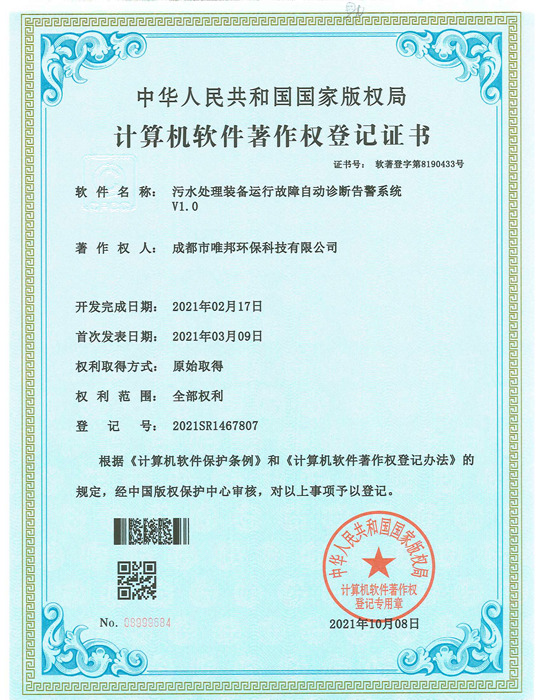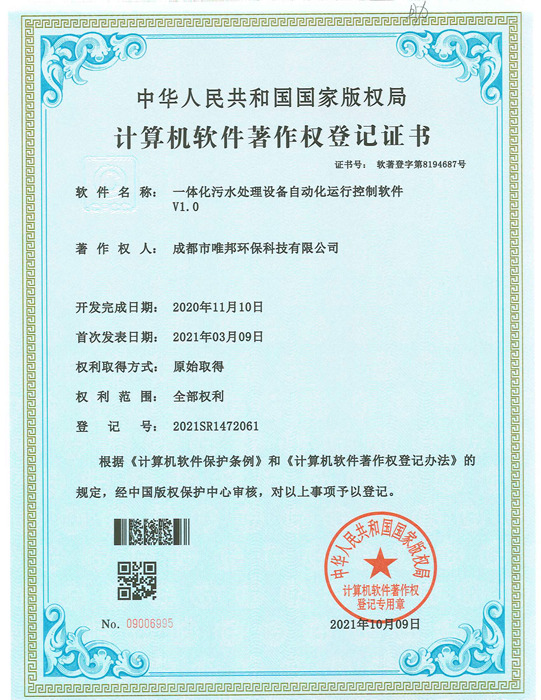 低耗能農村污水處理設備-證書